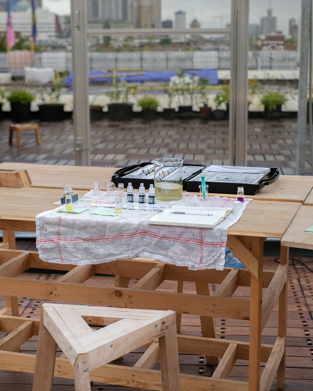 A small growing station with various tubs and containers was set up on the rooftop of EnergieKas. Duckweed was collected from several locations and additional plants were purchased from an aquarium shop in order to compare the behaviour of plants from different sources. The water was changed weekly and the condition of the plants was observed. Different nutrient levels were also tested to see which supported better growth.
